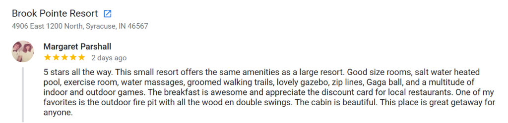 “5 stars all the way. This small resort offers the same amenities as a large resort. Good size rooms, salt water heated pool, exercise room, water massages, groomed walking trails, lovely gazebo, zip lines, Gaga ball, and a multitude of indoor and outdoor games. The breakfast is awesome and appreciate the discount card for local restaurants. One of my favorites is the outdoor fire pit with all the wood en double swings. The cabin is beautiful. This place is great getaway for anyone.” 5/5
