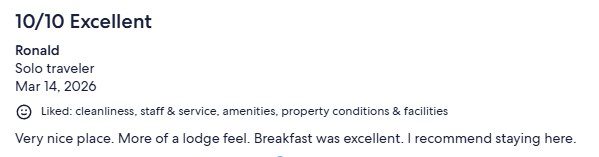 New review posted on Expedia today! March 14, 2026 Check out our newest review from Expedia posted today! “Very nice place. More of a lodge feel. Breakfast was excellent. I recommend staying here.” 10/10 Related postsMarch 2, 2026New review posted on Google today!Read more