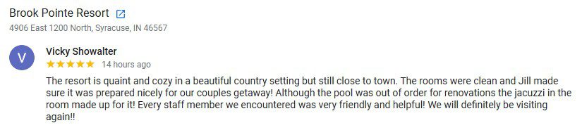 “The resort is quaint and cozy in a beautiful country setting but still close to town. The rooms were clean and Jill made sure it was prepared nicely for our couples getaway! Although the pool was out of order for renovations the jacuzzi in the room made up for it! Every staff member we encountered was very friendly and helpful! We will definitely be visiting again!!” 5/5.
