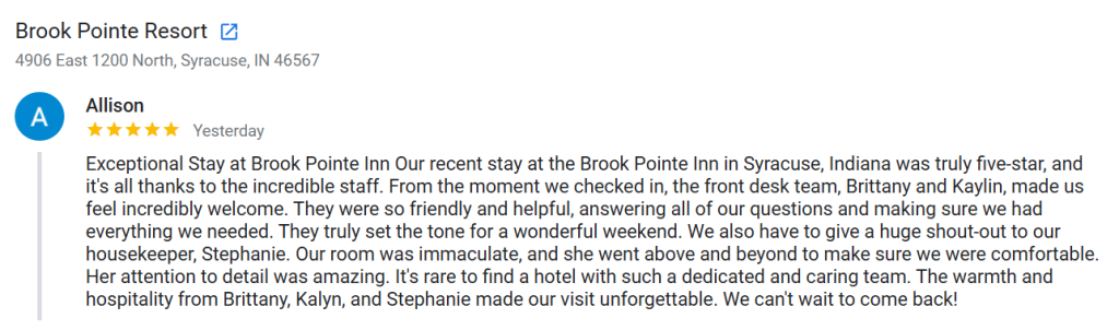 “Exceptional Stay at Brook Pointe Inn Our recent stay at the Brook Pointe Inn in Syracuse, Indiana was truly five-star, and it is all thanks to the incredible staff. From the moment we checked in, the front desk team, Brittany and Kaylin, made us feel incredibly welcome. They were so friendly and helpful, answering all of our questions and making sure we had everything we needed. They truly set the tone for a wonderful weekend. We also have to give a huge shout-out to our housekeeper, Stephanie. Our room was immaculate, and she went above and beyond to make sure we were comfortable. Her attention to detail was amazing. It is rare to find a hotel with such a dedicated and caring team. The warmth and hospitality from Brittany, Kalyn, and Stephanie made our visit unforgettable. We cant wait to come back!” 5/5