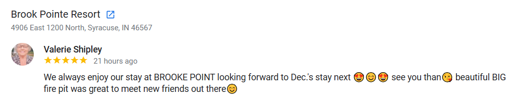 “We always enjoy our stay at BROOK POINTE looking forward to Dec.’s stay next, see you than beautiful BIG fire pit was great to meet new friends out there.” 5/5