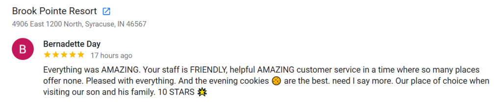“Everything was AMAZING. Your staff is FRIENDLY, helpful AMAZING customer service in a time where so many places offer none. Pleased with everything. And the evening cookies are the best. need I say more. Our place of choice when visiting our son and his family. 10 STARS.” 5/5