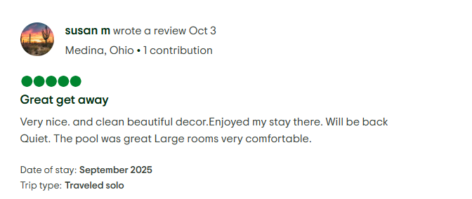 “Great get away. Very nice and clean beautiful decor. Enjoyed my stay there. Will be back. Quiet, The pool was great Large rooms very comfortable.” 5/5