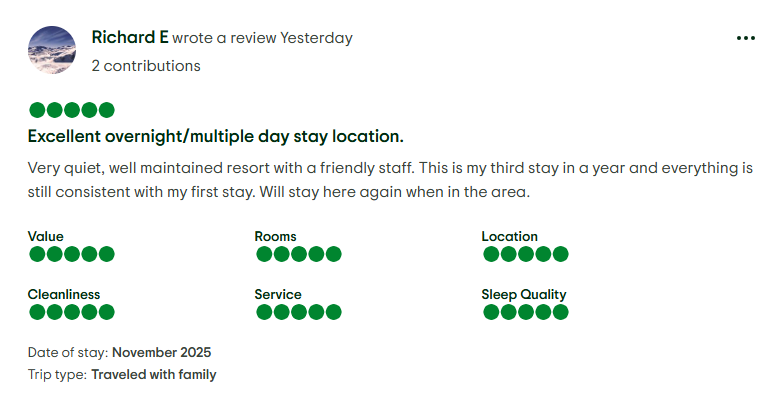 “Very quiet, well maintained resort with a friendly staff. This is my third stay in a year and everything is still consistent with my first stay. Will stay here again when in the area.” 5/5