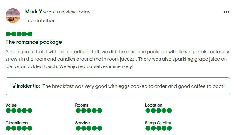 “A nice quaint hotel with an incredible staff, we did the romance package with flower petals tastefully strewn in the room and candles around the in room jacuzzi. There was also sparkling grape juice on ice for an added touch. We enjoyed ourselves immensely!” 5/5.
